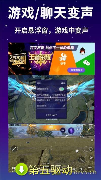 开启悬浮窗,按住悬浮窗按钮开始录音,即可自动倒计时播放变声后的声音,打开游戏麦克风,即可和队友畅聊,助你称霸峡谷和吃鸡!
