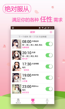 3.增加了默认的早睡闹钟,萌妹子哄你甜蜜入睡,贴心的早睡早起提醒,最懂你的神多多