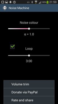 这个应用程序会产生白色,粉红色和红色的噪音,让您做出细微的调整,以噪音颜色(光谱分布)。它的稳定,重量轻,而且与手机的操作系统和其他应用程序的音频播放不错,而且用户界面是简单而实用。它没有起到任何预先录制的声音。这是它概括地说。如需更详细的信息,请继续阅读。