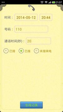 这是一个可以生成虚拟通话记录的软件,用户可以添加来电,去电,未接电话等通话类型,可以自己设置电话号码和通话时间和通话时长,然后点击生成记录。