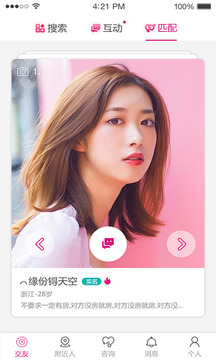 APP首页交友、咨询两大板块。并且通过实名认证体制通过注册,再以匿名交友或在线咨询的方式,以最大化的保护用户隐私,为用户提供更加安全及全面的服务体验。可以在申请注册成功后,即可在线进行交友互动聊天,可以通过择偶条件进行筛选匹配,精准度、效率度、满意度都将大幅度提供。