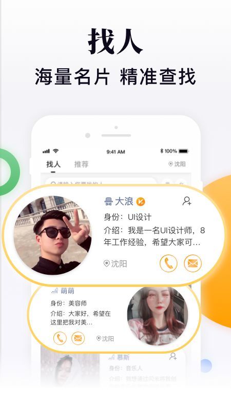 2、精确查找,快速的在软件当中完成你自己的查找,有着海量的线上名片,帮助你可以完成你的查找。