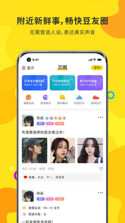 豆圈动态:在这里可以看到potato土豆用户的最新动态,也可以查看附近用户发起的组队活报,可以发照片参与。