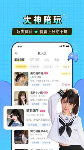 2、有一种开心叫做平躺着上分,热门游戏我区服全排位,24h急速接单子,带你轻轻松松上分,练英雄人物,练技术性,带吃鸡游戏,统统可以哦,高颜值视频语音连麦直播互动交流,遇上诱人的嗓音,和TA打开全新升级浪漫之地;