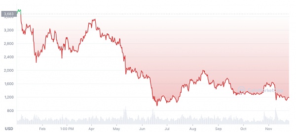 在2021年价格接近5000美元的后,以太坊在2022年的大部分时间里都在波动。尽管The Merge临近,但因为加密资产市场转为看跌,特别是在5月Terra LUNA和UST崩溃之后。ETH价格在上半年大幅下跌。