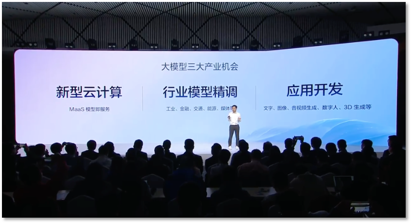 在解释文心一言以及底层的文心大模型会带来哪些创业机会和投资机会时,李彦宏说,大模型将带来三大产业机会,包括新型云计算、行业模型精调和应用开发,而有关文字、图像、音视频生成、数字人、3D生成等的应用开发是“最大的机会”。