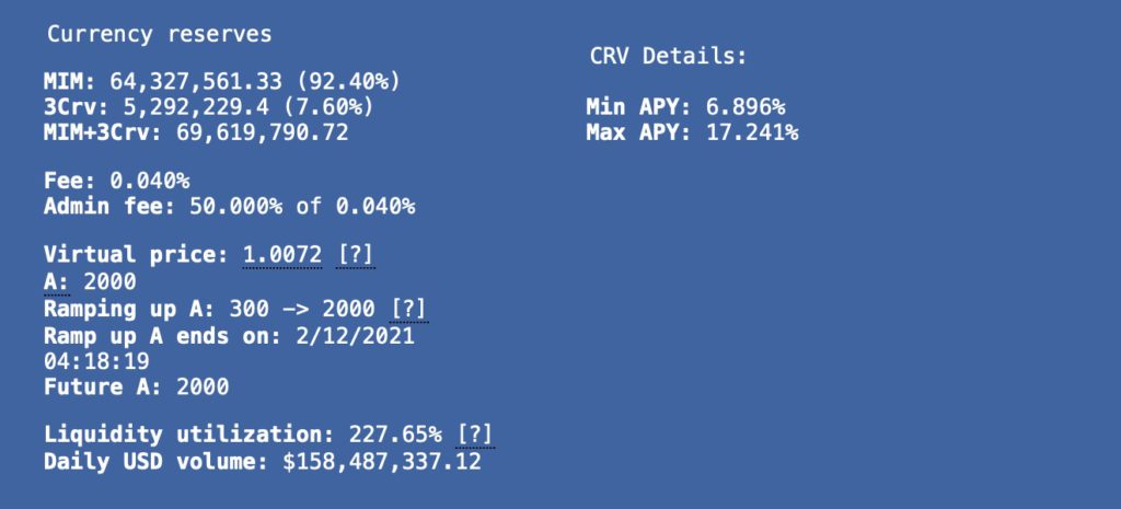 但据用户常使用来兑换MIM的稳定币协议Curve数据,当前MIM/3Crv流动性池已出现严重倾斜,MIM占比高达92.4%,并因3Crv(DAI、USDT、USDC)资产比例太低而暂停了兑换功能。