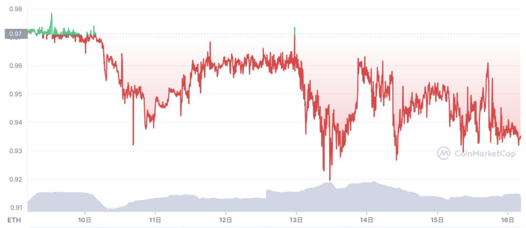 在stETH产品周期的大部分时间里,都与ETH的交易比例接近1:1,但据CoinMarketCap数据,stETH/ETH交易对的汇率已经持续近一周保持3%以上的脱钩,最低甚至在周一(13日)跌破0.92。
