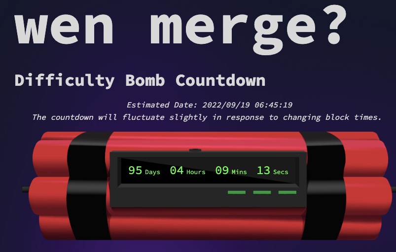 据以太坊合并倒数网站wenmerge数据,难度炸弹目前预计将在9月19日实施。