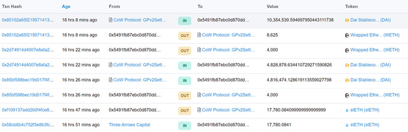 据区块链浏览器显示,标记为三箭资本内部钱包地址于14日下午5点51分左右,使用交易聚合器CowSwap,将17780.08枚stETH兑换为16625.07枚ETH,最后再将其尽数换为19,999,892.357DAI,交易市值约两千万美元,以太坊成交均价为1202.99美元。