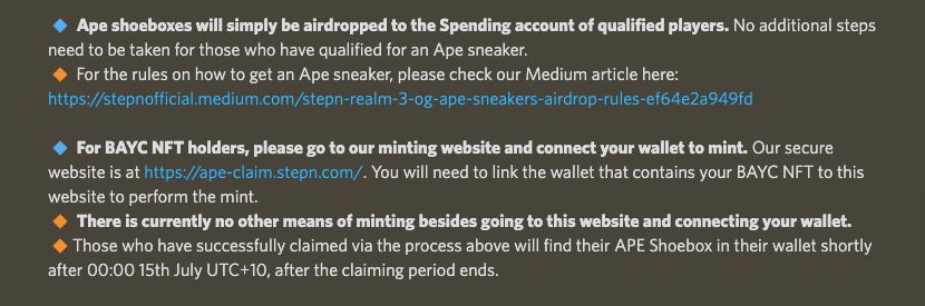 此外,对于先前被无聊猿(BAYC)泼冷水,澄清双方没有正式合作关系一事,STEPN团队回应称,给予BAYC持有者空投主要是为激励他们加入STEPN社区,并且BAYC持有者还需要在推特上发布相关讯息才能领取空投,这将有助于将STEPN的意识传播到更广泛的加密社区。