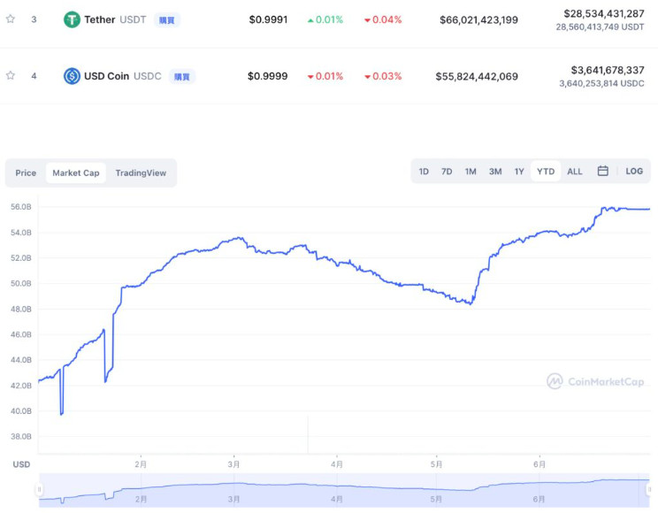 目前据CoinMarketCap数据,USDC的市值维持在558亿美元的历史高点,高居稳定币市场第二;相较于近期市值缩水上百亿降至660亿美元的龙头USDT,双方差距正逐步缩小中。
