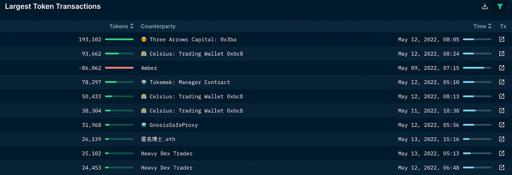 Nansen还提及,Celsius、三箭资本这两大机构,借由从Curve的stETH/ETH池撤出大量流动性,可能对stETH价格下跌产生了最大影响,在5月12日,三箭资本撤出价值4亿美元的流动性(12.8万枚stETH和7300枚ETH),Celsius在同日则透过三笔交易撤出价值3.8亿美元的流动性。