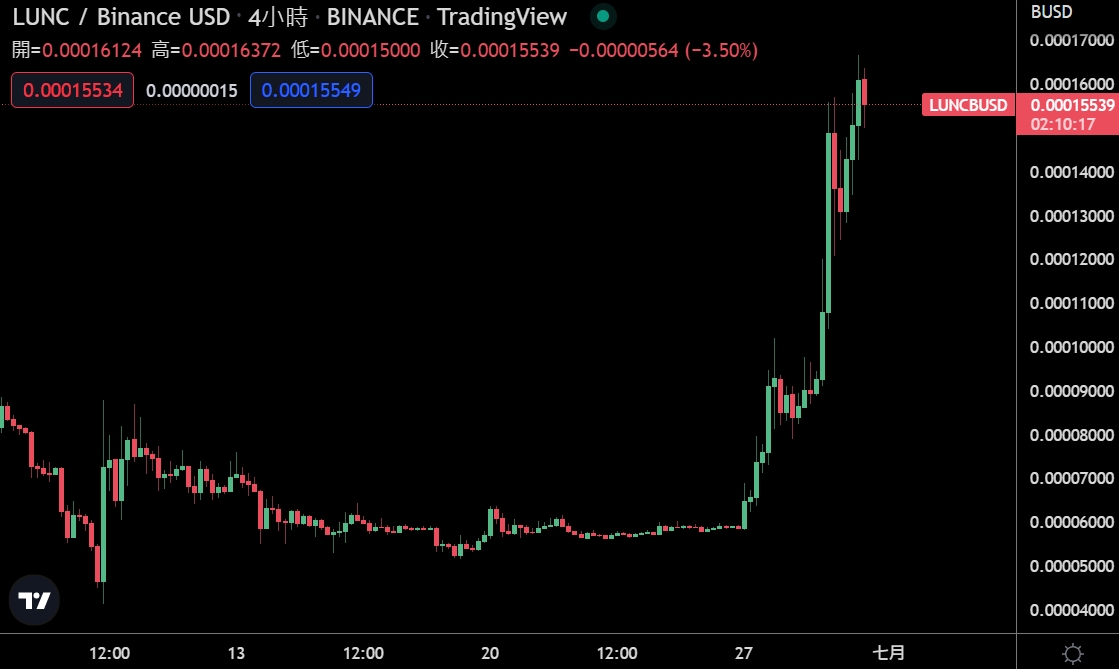 据Tradingview数据,Terra2.0新链上线后,LUNC、USTC价格原本持续探底,LUNC最低在9日触及0.00004123美元低点,但此后却开始上扬当天大涨逾60%,而自26日起又再一路逆市暴涨,在29日冲上0.00016663美元高点,在3日内最大涨幅超过186%。至截稿前,LUNC报0.00015522美元,近24小时涨幅26%。