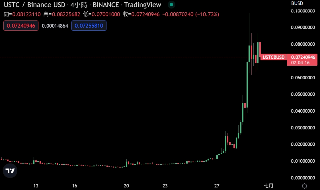 与此同时,USTC价格自18日触及0.00587285美元低点后,也开始一路上扬,自26日起加速暴涨,在29日冲上0.09870440美元高点,在3日内最大涨幅超过882%。至截稿前,USTC报0.07240946美元,近24小时涨幅58%。