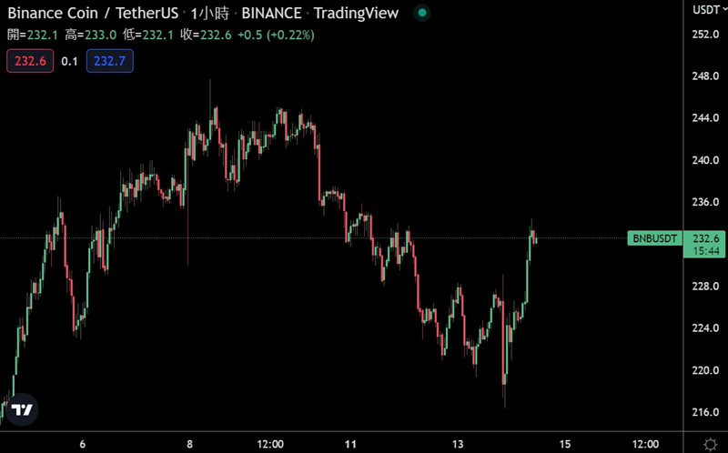 据Tradingview数据,在币安完成第20次BNB销毁之际,BNB价格自昨晚8时起,从216.4美元开始一路上扬,最高涨至234.4美元,涨幅超过8%,至截稿前,报232.6美元,近24小时涨幅3.98%。