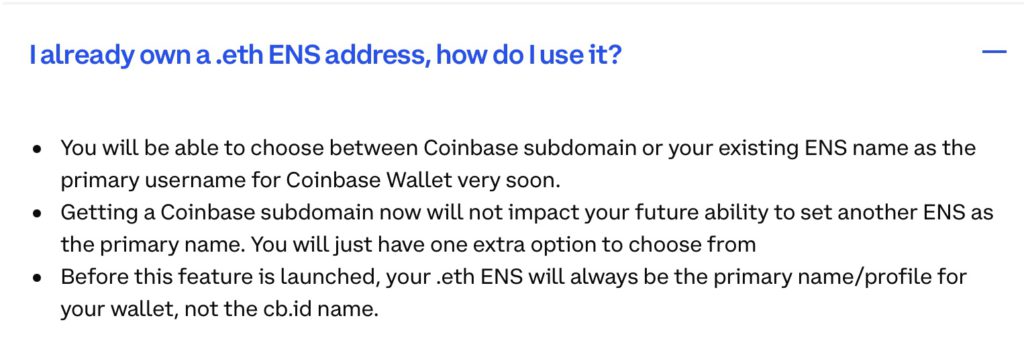 Coinbase强调用户获得的Coinbase子域并不会影响未来将另一个ENS设定为主名称的功能,用户也只能从中选择其中一个选项。