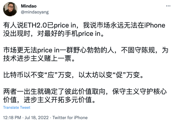dForce创办人杨民道则是认为,有人说以太币上涨的现象是基于以太坊合并的买气,但他认为在市场还没有出现最好的产品时,就对最好的产品产生价格反应。他也认为,比特币与以太坊的价值取向本来就不同。