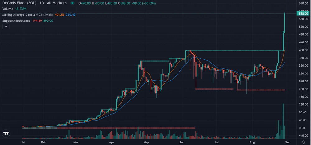 币圈子(120BTC.com)讯:据HelloMoon.io数据显示,Solana NFT项目DeGods近期地板价一路狂飙,在8月21日时仅为约255枚Solana,但到了29日,已经飙升至588枚Solana(约1.76万美元),短短8日涨幅达130%,地板价更不断刷新历史新高。