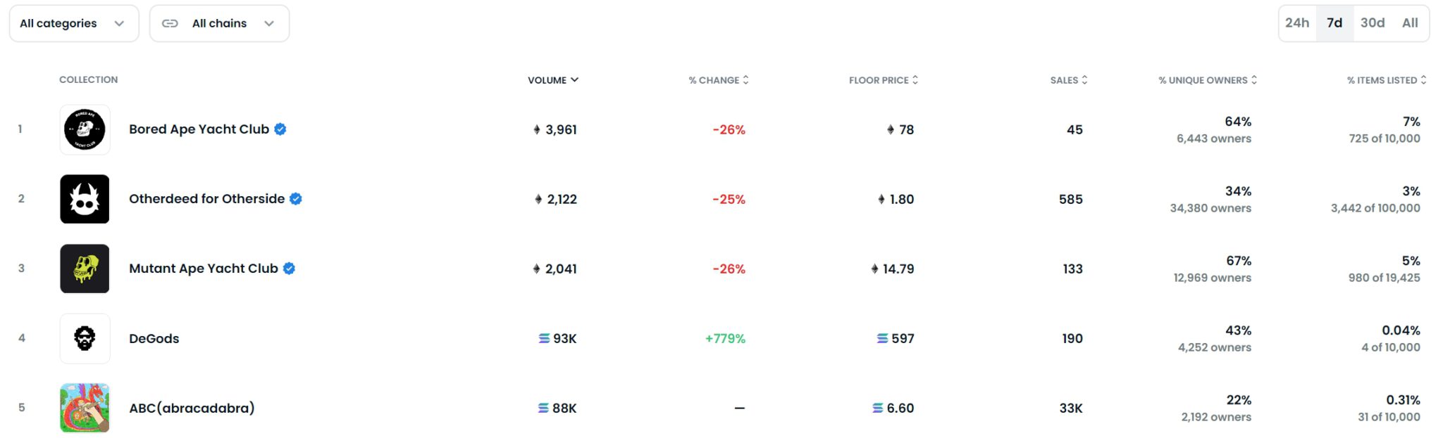 DeGods是最近7日OpenSea交易量第四大NFT项目