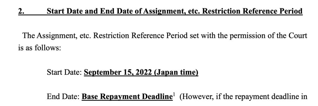 需要注意的是,法院已受理还款流程的「转让限制参考期」,也就是说从9月15日开始到未定义的结束日期间,禁止债权人转让、转移、继承、抵押或以其他方式处置所获债权。文件表示,如果在限制期内提交转让通知,受托人可能无法确定该向谁偿还:这可能会导致重整债权人无法收到他们的还款,与其他重整债权人相比,还款日期显著延迟,或者最坏的情况是,还款金额可能会根据法律法规存入东京法务局。