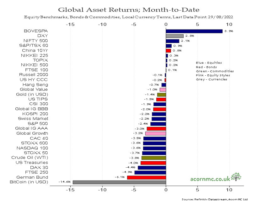 值得注意的是,根据英国宏观经济研究公司Acorn Macro Consulting提供的全球资产月度回报率数据,比特币8月迄今跌幅达到14.6%,已成为今年8月全球表现最差的资产。