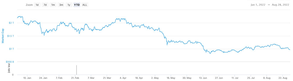 随着加密货币市场连日重挫,Coinmarketcap数据显示,全球加密货币总市值已跌破1兆美元大关,是自7月下旬以来首次。至截稿前,全球加密货币总市值为9996亿5904万191美元。