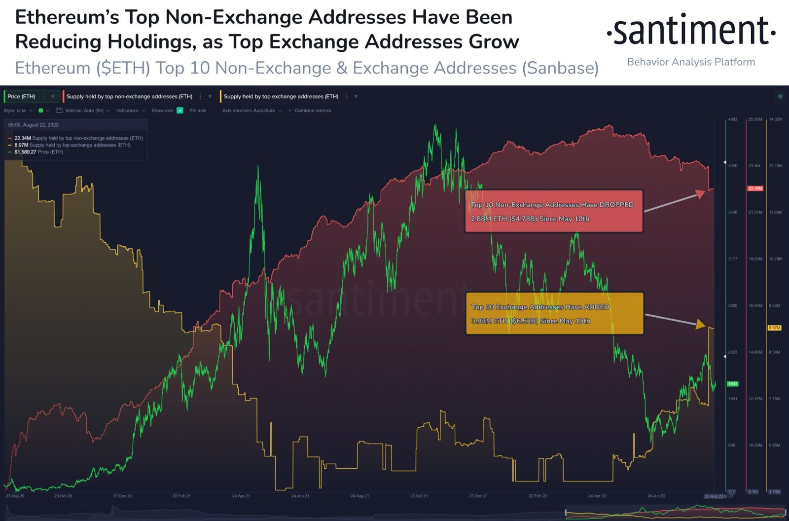 随着合并在即,ETH价格和市场看涨热情似乎正在降温。区块链数据分析公司Santiment数据表明,顶级鲸鱼地址在过去三个月里向交易所发送了大量的ETH。
