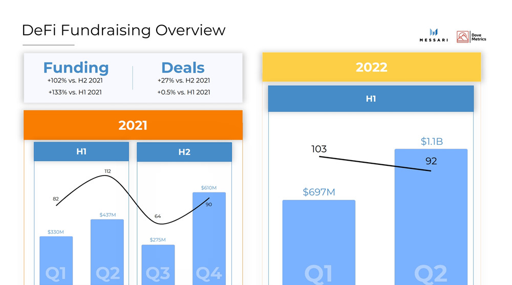 2022年上半年,DeFi融资交易规模达18亿美元,与2021年下半年相比成长102%,与2021年上半年相比成长133%。以以太坊为基础的项目在DeFi领域中筹集了大部分资金,总融资规模为13亿美元,而非以太坊项目为5.02亿美元。