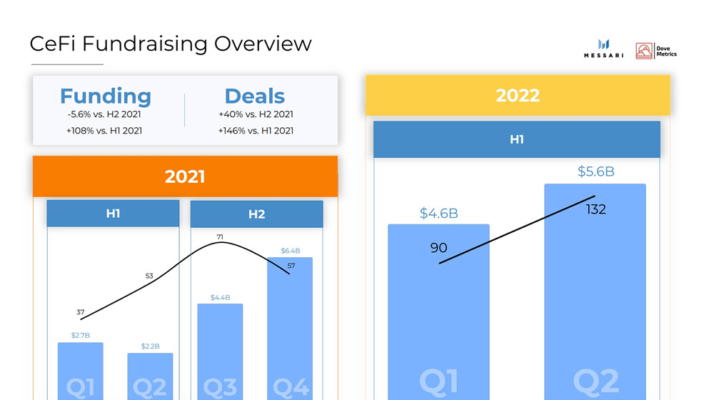 CeFi融资交易规模达到102亿美元,与2021年上半年相比成长108%,与2021年下半年相比减少5.6%。该报告指出,CeFi领域较为成熟,规模达1000万美元以上的融资轮,占CeFi总融资笔数47%,而规模5-1000万美元的融资轮,占CeFi总融资笔数达18%。