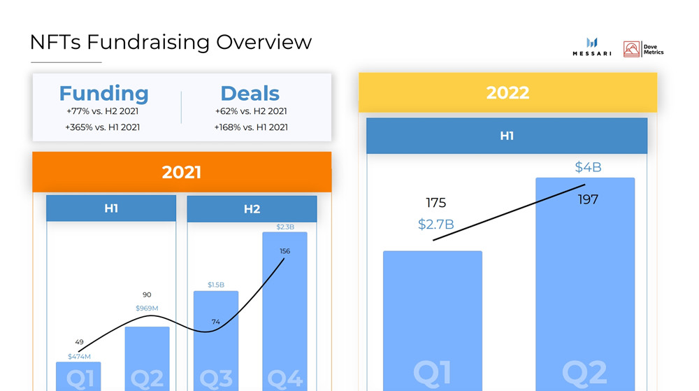 NFT融资规模达到67亿美元,与2021年下半年相比成长了77%,与2021年上半年相比成长了365%。在NFT领域中,筹集资金最多的垂直领域是游戏NFT,总共筹集了41亿美元的资金。