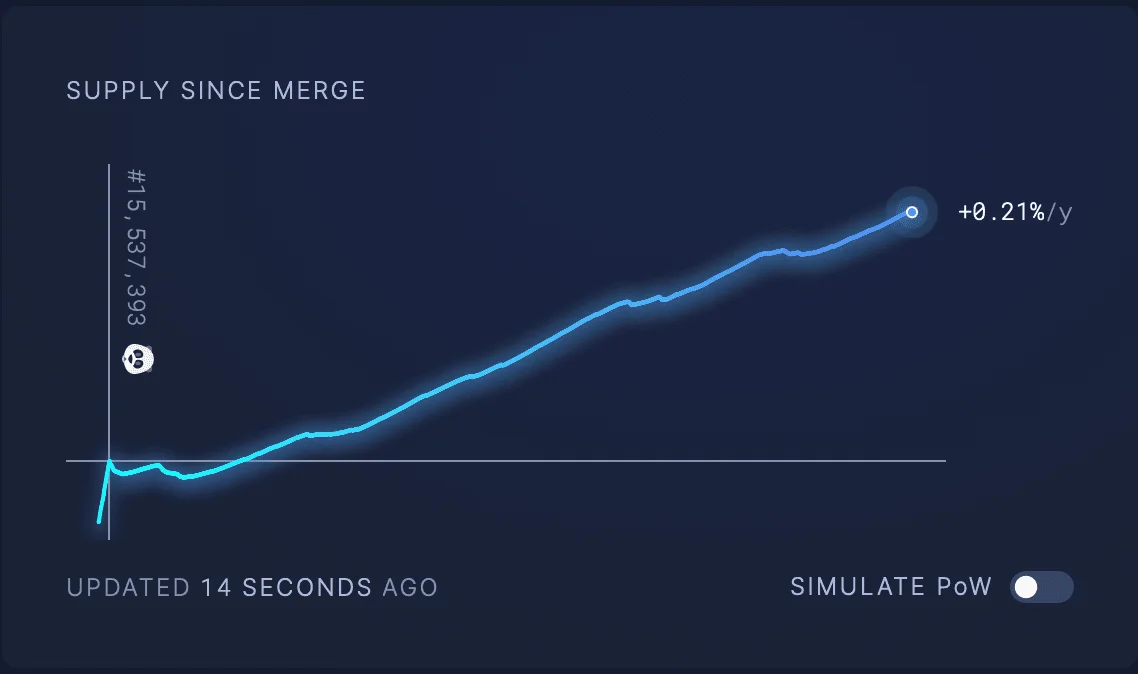 不过,根据Ultrasound Money的数据,在合并升级后,以太币供应仍以每年0.2%的速度增加。