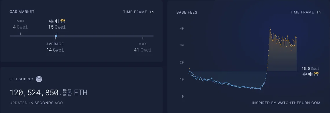 数据显示,以太坊网络的手续费必须维持在15Gwei左右,才能抵销发给验证者的以太币奖励。然而,在9月20日,手续费平均大约在14.3Gwei,代表以太币供应量还是在增加。