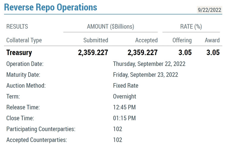 币圈子(120BTC.COM)讯:美国联准会在昨日宣布再次加息75个基点、将联邦基金利率目标区间上调至3%至3.25%之间的1天之后,纽约联邦准备银行官网数据表示,货币市场基金和其他机构22日在该行的隔夜逆回购工具上,投入了创纪录的2.359兆美元资金。