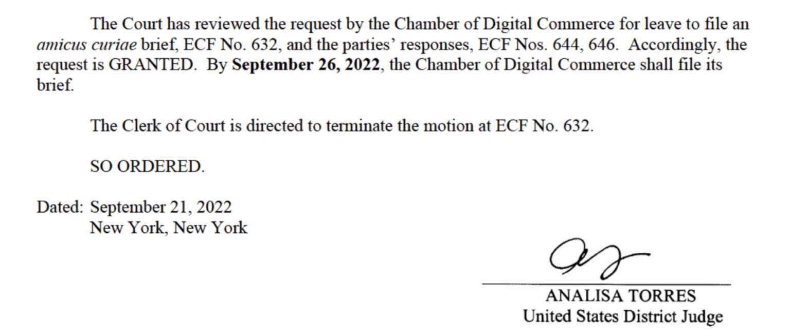 据本周三(21日)公开的最新文件,联邦法院已批准美国数字商会(The Chamber of Digital Commerce)提交法庭之友意见书(amicus curiae brief)的申请,该商会负责人表示:我们需要为新兴行业制定一套「明确且一致」的规则。