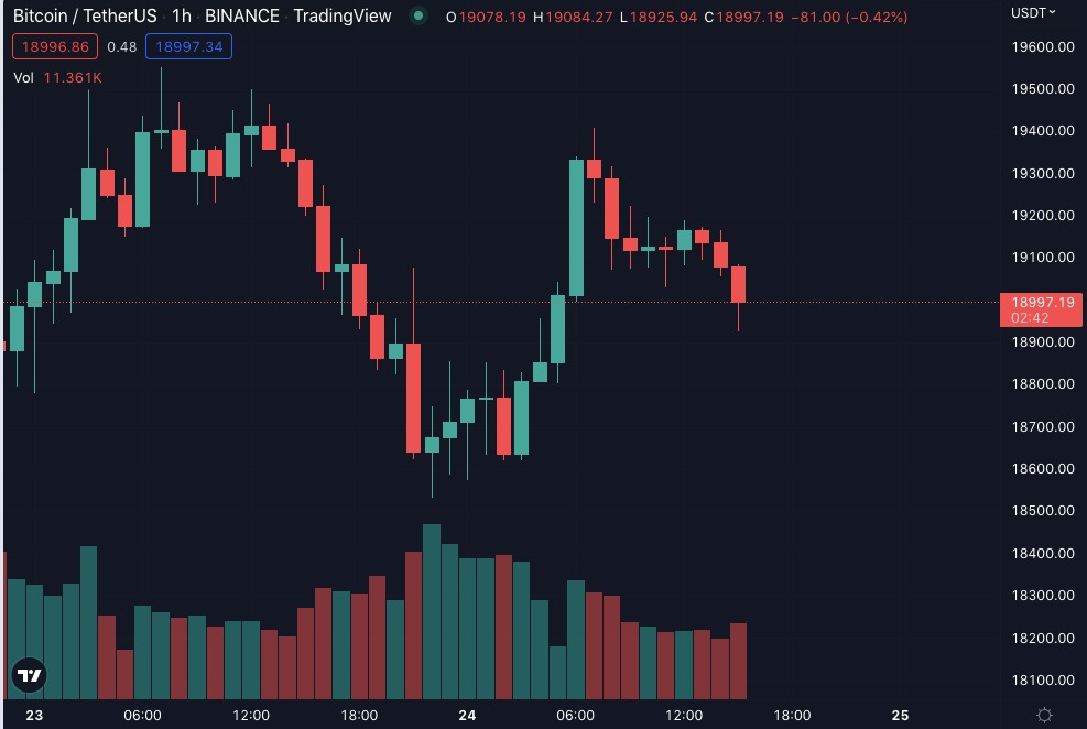 比特币昨(23)日深夜从18,531美元的低点涨至今早高点19,406美元,最大涨幅约4.7%,截稿前再跌破19K,报18,997美元,近24小时涨幅约1.29%。