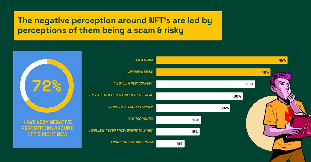 72%的人对NFT持非常负面的看法。其中,46%认为NFT是骗局、不明智的货币投资,40%认为NFT风险不明(例如长期价值、购买/销售潜力、未经核实的资产等),35%认为NFT仍然是个过于新颖的概念。
