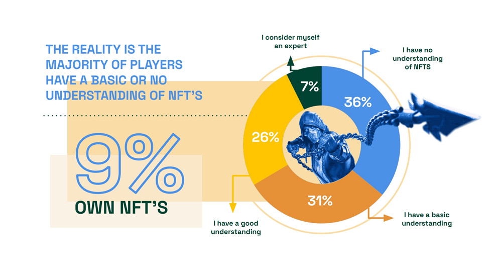 另外,只有9%的游戏玩家拥有NFT,67%的消费者对NFT只有基本了解或根本不了解,13%的游戏玩家认为NFT和其他区块链技术将大幅推动游戏领域的创新,88%的游戏玩家认为课金获胜对玩家不利。