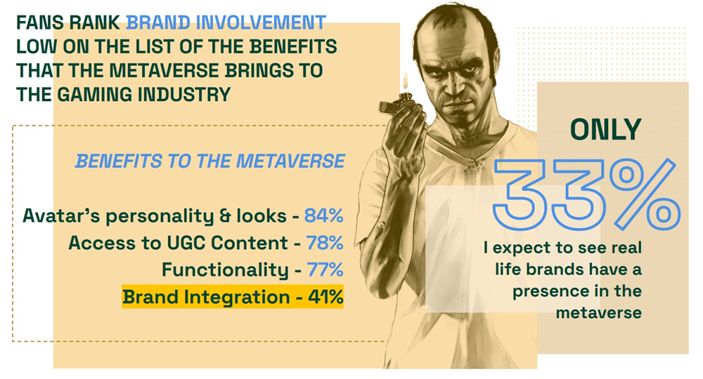 不过在元宇宙中,品牌给消费者的兴趣仍然低迷,只有33%的玩家希望看到现实生活中的品牌出现在元宇宙,另只有28%的玩家认为,在元宇宙中拥有商品的品牌,将改变他们在现实生活中的看法。
