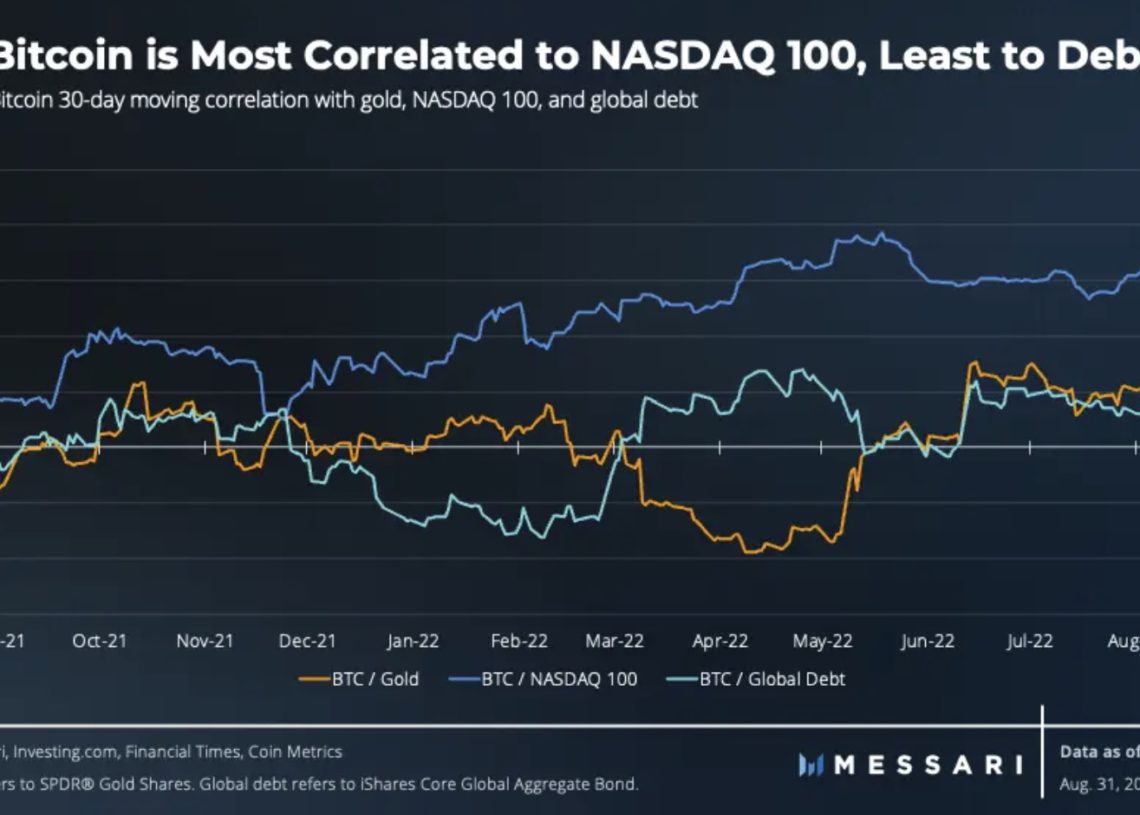 Messari表示,随着美国的通货膨胀达到数十年来的高点,比特币也创下了新的周期低点,其价格走势并不像价值储存,而更类似于美国纳斯达克科技股的价格走势。数据表示,第三季因为通膨和加息占据主导地位,比特币与纳斯达克100指数之间的平均相关性为0.6;相比之下,数位黄金和实体黄金的相关性则要小得多,两种资产在Q3的平均相关性为0.2。