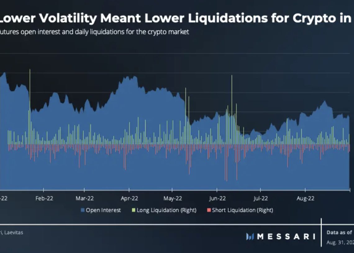 但尽管价格持续低迷,Messari指出比特币在第三季度的波动性呈现下降趋势。8月份的30天平均波动率为60%,而6月份则超过80%。较低的波动性也让加密货币市场的清算减少。