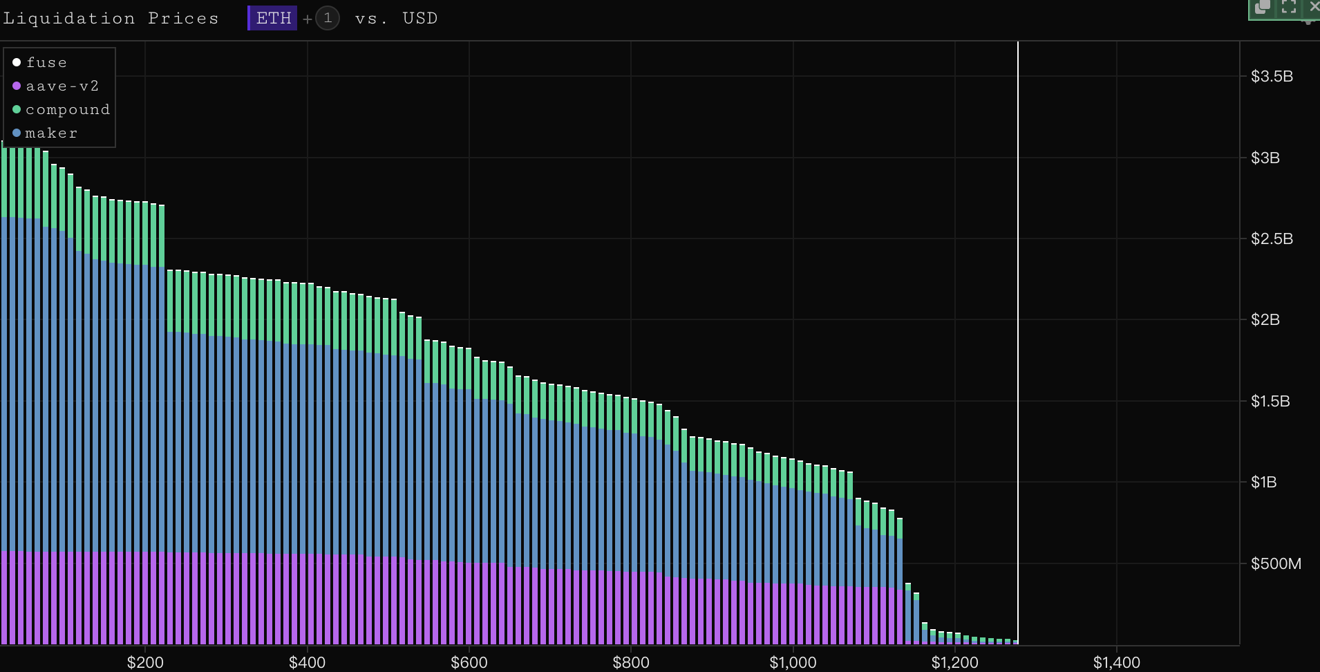 据Parsec Finance数据,以太坊在1100美元至1200美元区间存在9亿美元来自DeFi协议的清算压力,AAVE和MakerDao各有约3.5亿美元,Compund约有1.7亿美元。不过链上清算值和清算量会随着用户对担保品头寸的调整而动态调整。